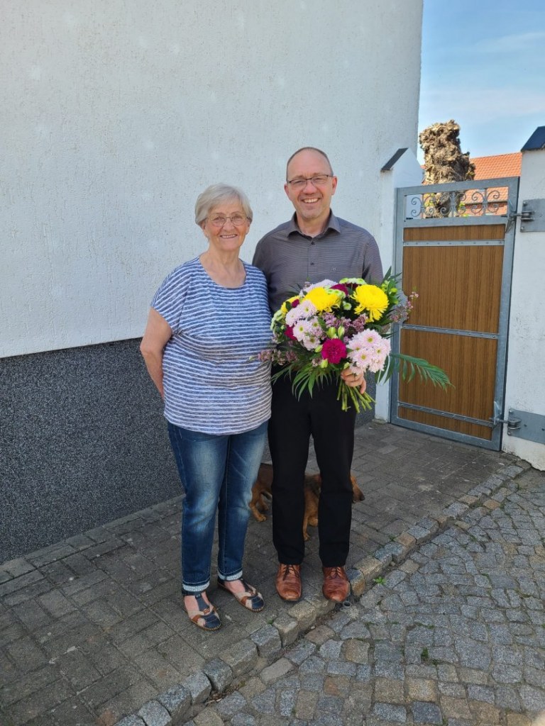 Am 29.04.2025 bedankte sich unser Geschäftsführer Sven Knoche mit einem großen Blumenstrauß bei Frau Ingrid Achtert (im Bild mit Hofhund) für ihre langjährige Leitung unseres Chores „Musica“ und wünschte ihr alles Gute für die Zukunft.